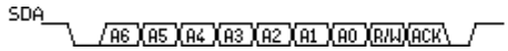 On remarque ici que les bits D7 à D1 représentent les adresse A6 à A0, et que le bit D0 et remplacé par le bit de R/W (L/E) qui permet au maître de signaler s'il veut lire ou écrire une donnée. Le bit d’acquittement ACK fonctionne comme pour une donnée, ceci permet au maître de vérifier si l'esclave est disponible.